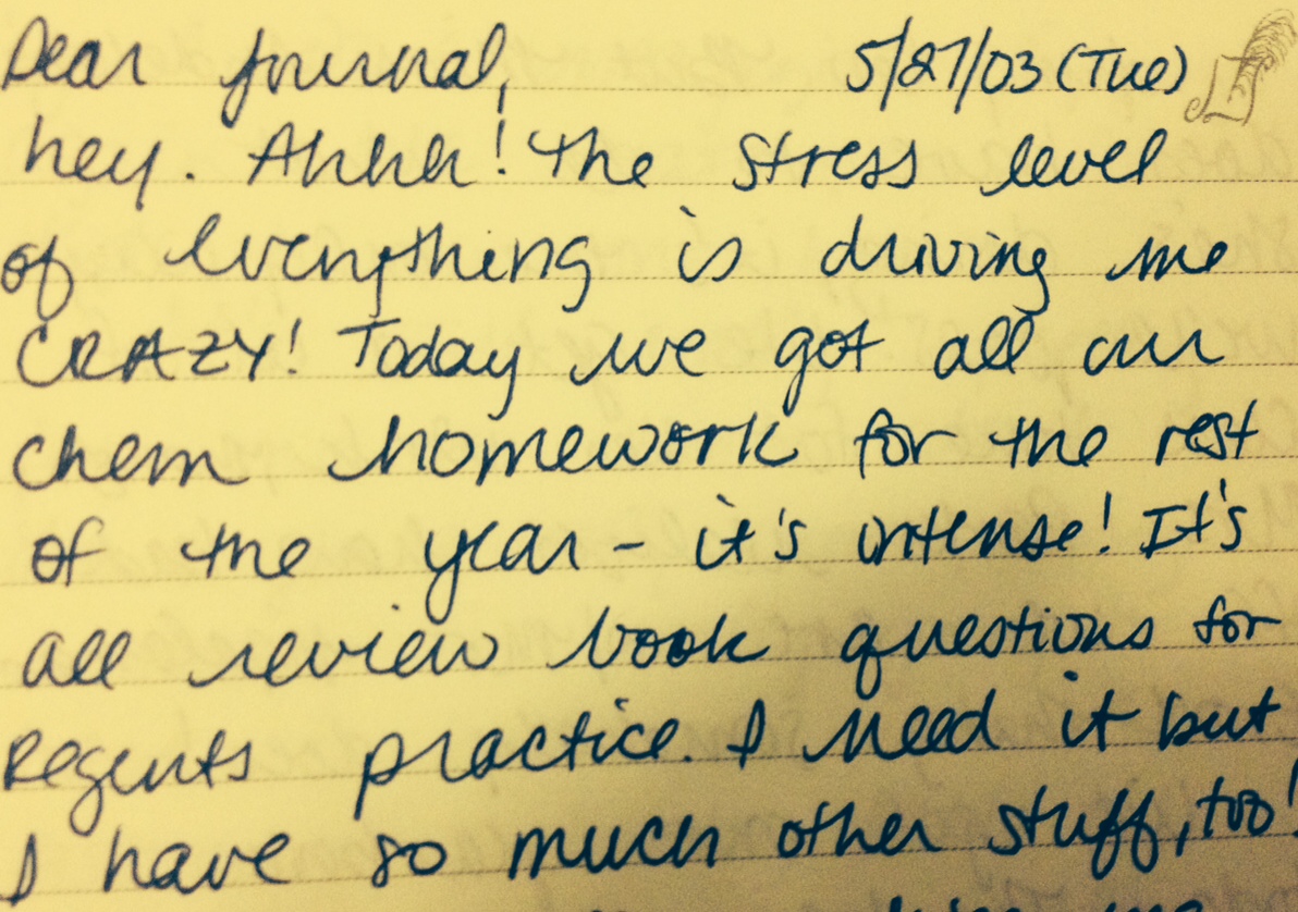 Honestly, I forgot how hard high school was. I forgot how stressed I became over school, sports, a part time job and friends. The excerpt photographed is from May, 2003. As juniors, we had to take five NYS Regents (English, American History, Chemistry, Math B and Foreign Language) exams within the same week. It was grueling. Studying for and passing these exams was all I wrote about for a month.